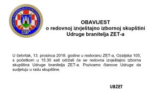 13. prosinca održana je redovna izvještajno izborna skupština Udruge branitelja ZET-a. Skupština je prihvatila izvješća o radu Udruge te nakon izbora jednoglasno je izabran predsjednik Udruge a to je dosadašnji predsjednik Darko Matijević.