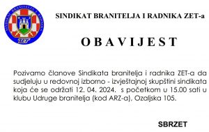 U petak, 12. travnja održana je redovna izvještajno izborna skupština Sindikata branitelja i radnika ZET-a. Skupština je prihvatila izvješća o radu Sindikata te prihvatila izbor kandidata za upravni i nadtorni odbor te sud časti koji će obnašati dužnost u narednom četverogodišnjem mandatu.