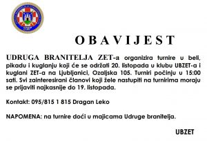 U petak, 20. listopada u organizaciji Udruge branitelja ZET-a održani su tradiconalni “Turniri petnaestorice” u pikadu , beli i kuglanju. Turniri su kao i uvijek protekli u fer i korektnoj borbi a sve je začinjeno odličnom muzikom i pjesmom naših Ivice Gašpara i Josipa Kobalija te još boljim roštiljem naših kuhara Ivice Vugera, Bože Toplaka i Mirka Kuštana. Najuspješniji bili su: